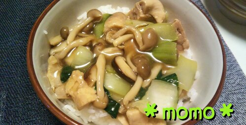 きのこたっぷりのチンゲン菜と鶏肉のあんかけ丼です。